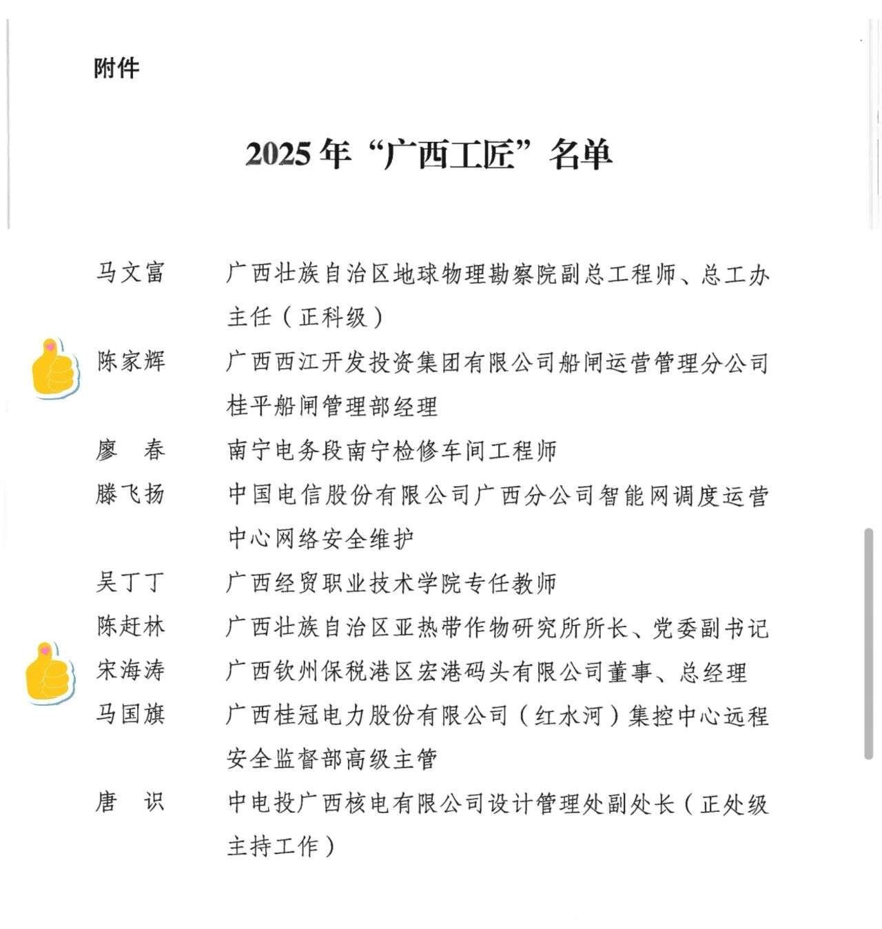 近日,自治区总工会、工信厅、科技厅、人社厅联合印发通报,认定40名同志为2025年“广西工匠”。北部湾港集团下属西江集团桂平船闸陈家辉、宏港码头宋海涛光荣上榜!