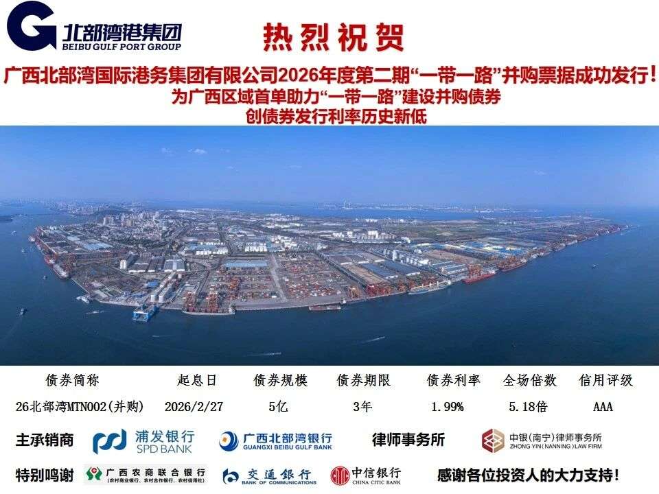 近日,北部湾港集团成功发行2026年度第二期“一带一路”中期票据(并购),凭借较强的市场认可度与清晰的市场定位,圆满完成5亿元融资目标。本期债券发行期限3年,最终票面利率仅1.99%,创北部湾港集团所有债券品种发行利率历史新低,全场认购倍数高达5.18倍,充分彰显资本市场对北部湾港集团践行“一带一路”倡议、推进西部陆海新通道建设的坚定信心。为践行“一带一路”倡议、西部陆海新通道建设注入更强动力。通过本次融资赋能,北部湾港将进一步完善港口运营体系,提升码头通过能力与智能化水平,强化“港口+物流+贸易”一体化服务能力。