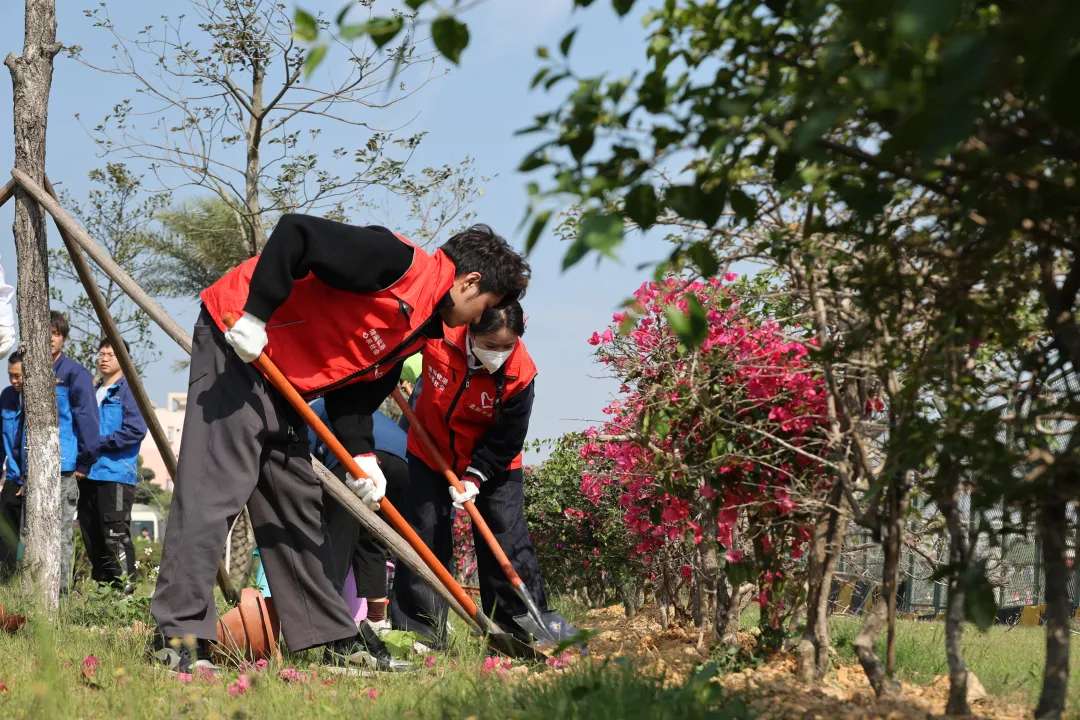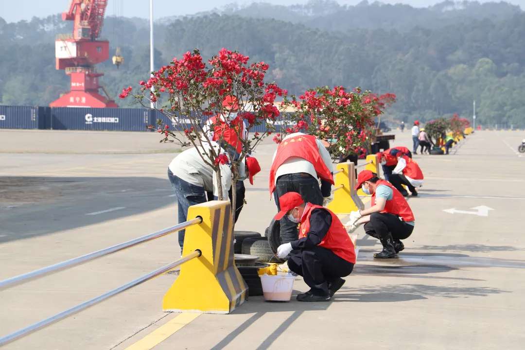 北港物流在西部陆海新通道钦州、北海联运中心,挥锹铲土,种下朱槿花、桃花和荔枝树苗。大家三五成群,分工协作,扶苗、培土、浇水,配合默契,共建绿色美好园区。