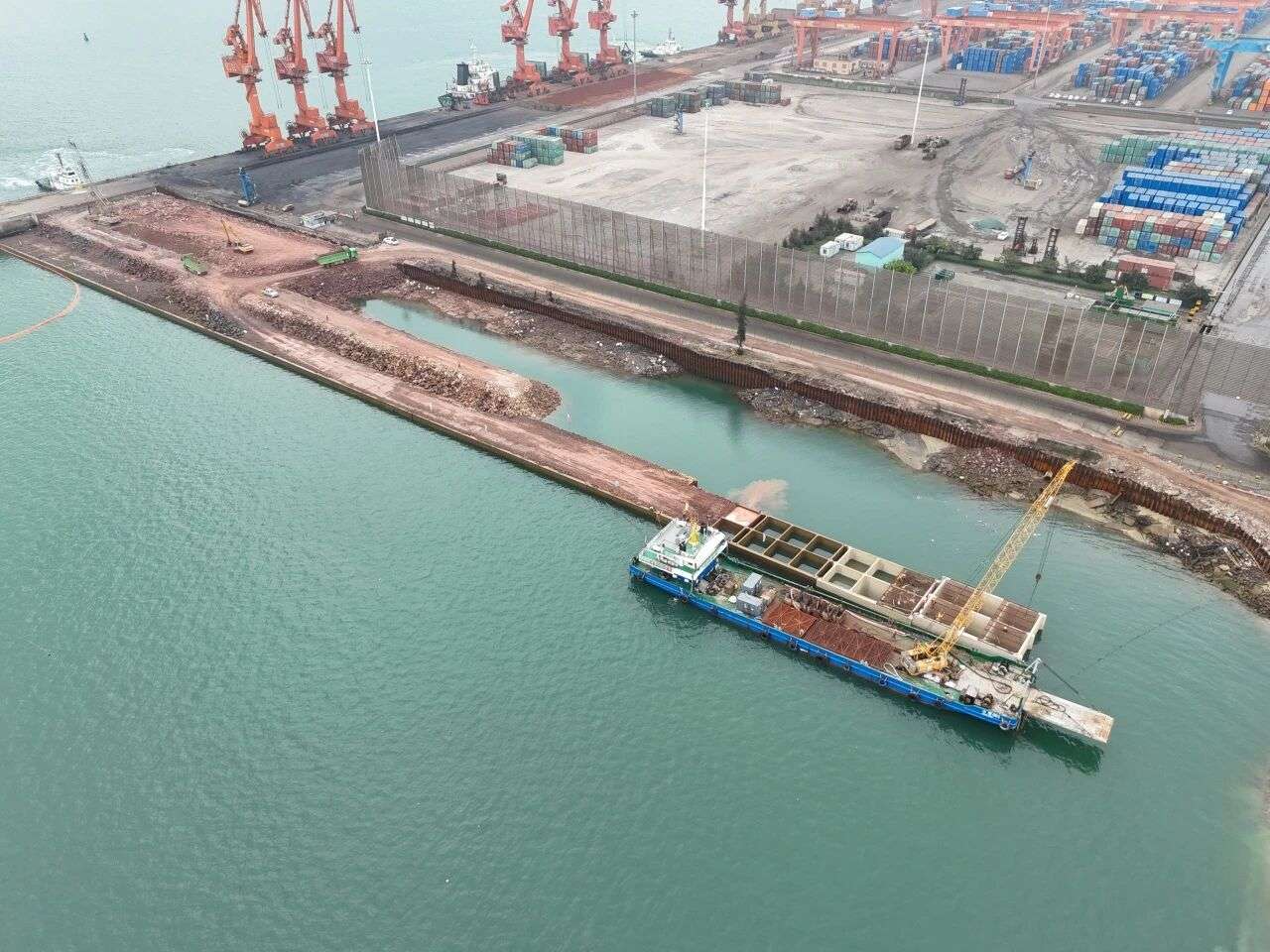 本次安装的沉箱为1号、2号泊位岸壁式沉箱结构的重要组成部分。截至目前,项目沉箱预制完成44座,出运38座,安装完成25座,1、2号泊位沉箱的顺利收官,为项目整体推进奠定了良好基础。目前,项目后方陆域土方回填已全部完成,强夯施工基本结束,防风网、斗轮机基础、堆场铺面等各项工序正同步推进。