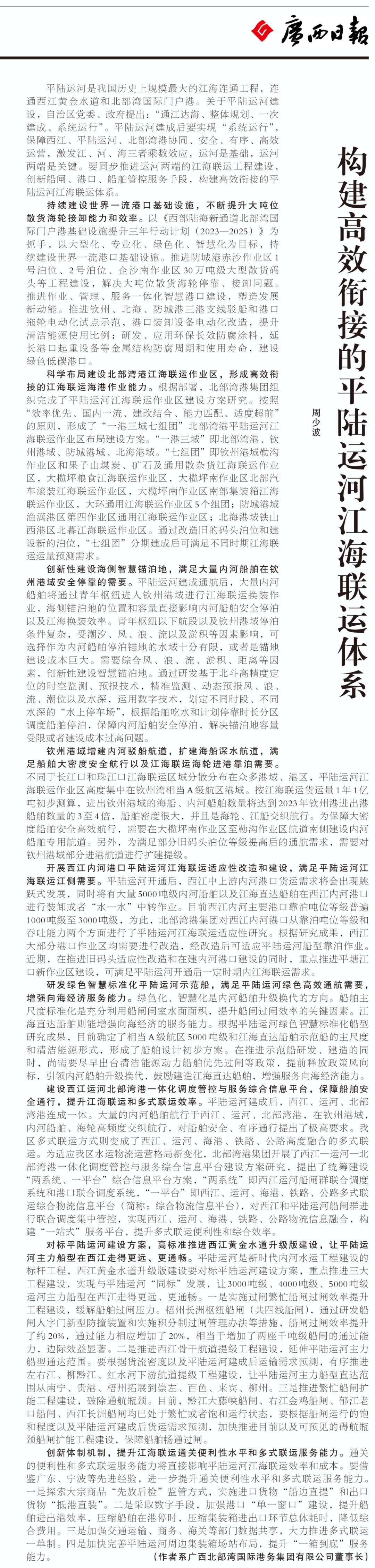 北部湾港集团党委书记、董事长周少波于2024年11月22日,在《广西日报》刊发署名文章《构建高效衔接的平陆运河江海联运体系》,阐述了北部湾港集团为构建高效衔接平陆运河江海联运体系提供了全面、系统的思路和措施,对于推动广西向海经济发展具有重要意义。