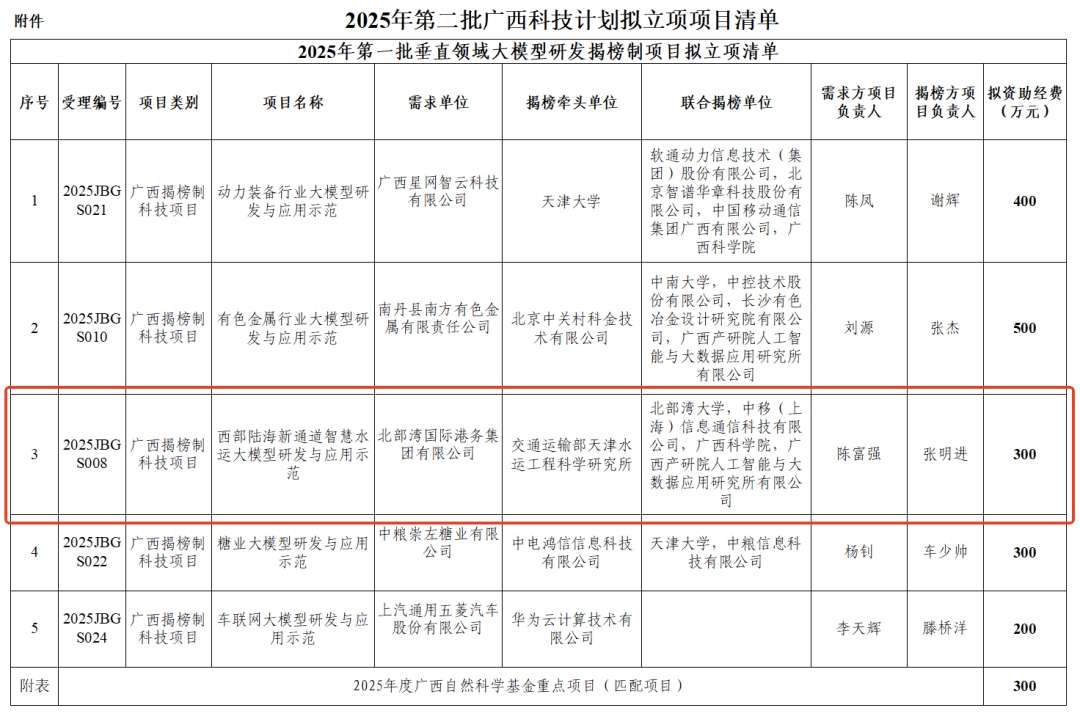 近日,北部湾港集团《西部陆海新通道智慧水运大模型研发与应用示范》成功入选自治区科技厅2025年第一批垂直领域大模型研发揭榜项目立项清单。