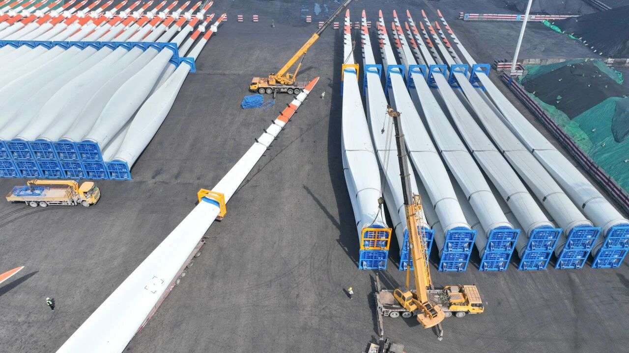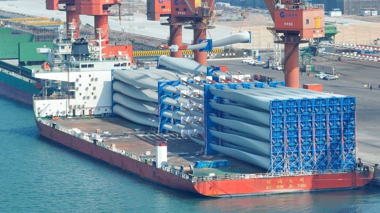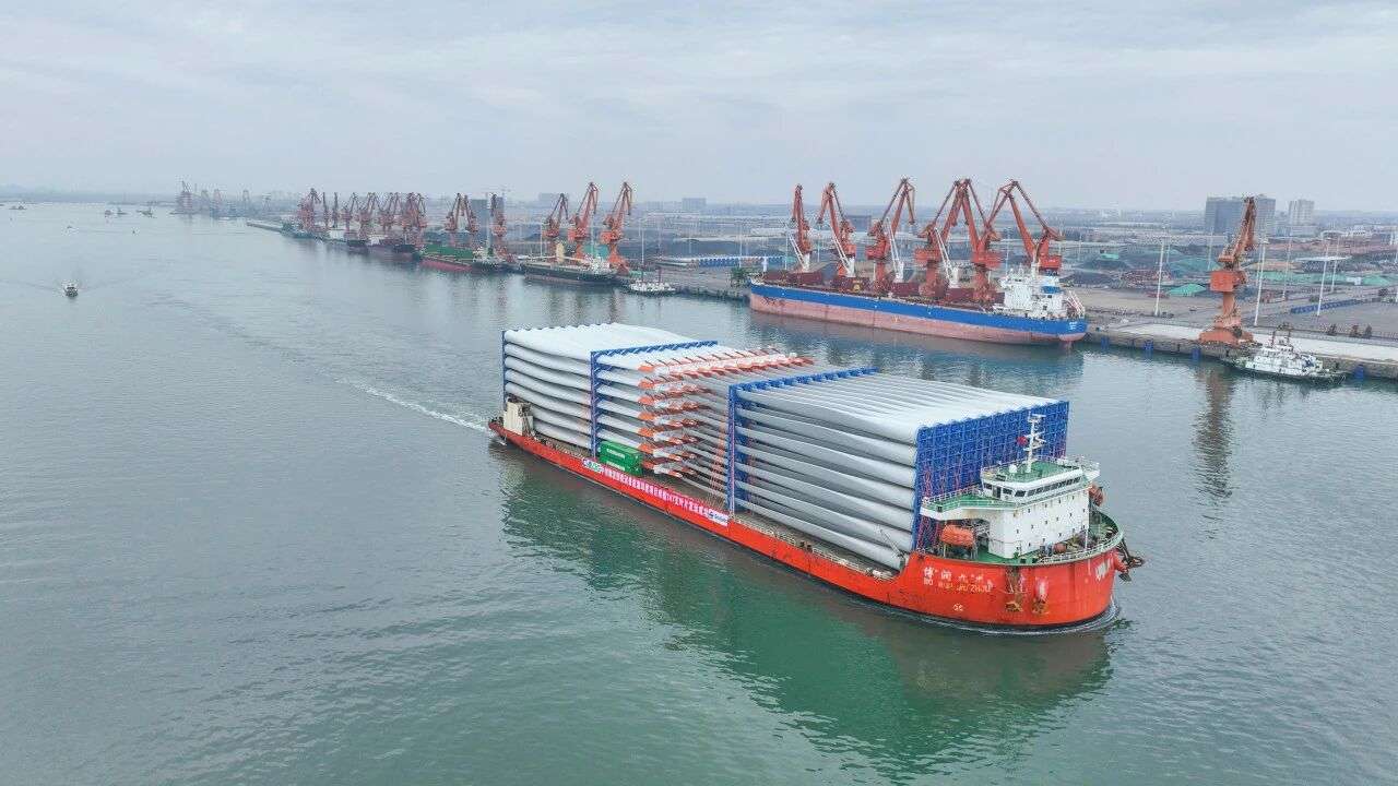 满载着风电叶片的轮船驶离港口