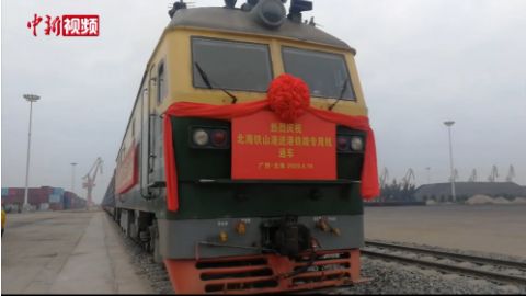 【解说】4月16日,广西北海铁山港进港铁路专用线正式通车,一列装载着60箱原煤的列车从铁山港开出,驶往广西玉林,这标志着铁山港海铁联运“最后一公里”打通,实现了铁山港国内外物资港口与铁路的无缝对接。